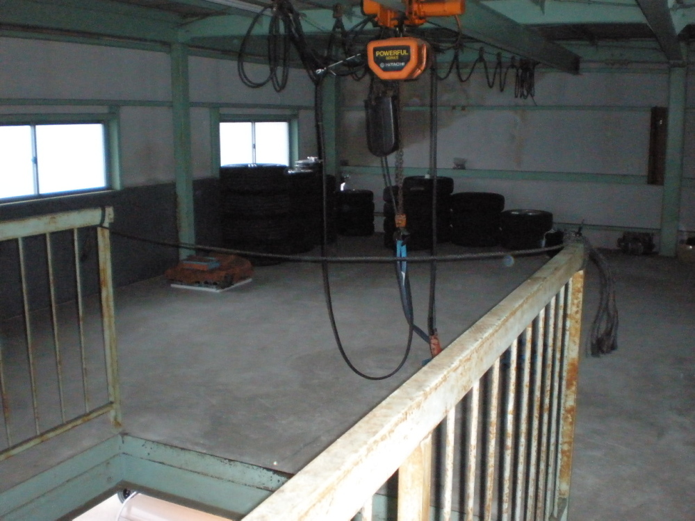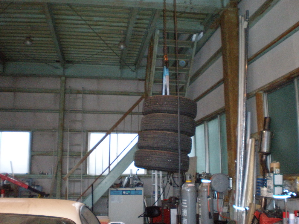 預かったタイヤをホイストを使って